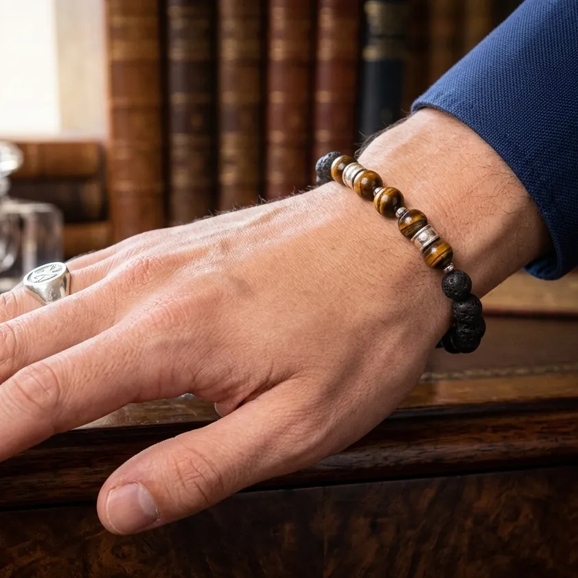 El ojo de tigre y la roca volcánica, comúnmente combinados en joyería, ofrecen una sinergia de protección y estabilidad. El ojo de tigre se asocia con el coraje